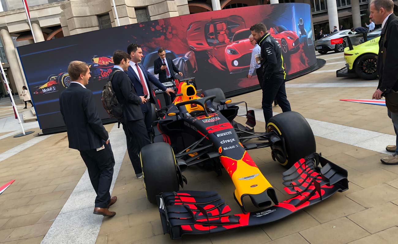 This event in the heart of London was built overnight to celebrate Aston Martin starting life as a public company and floating on the London Stock Exchange. A huge curved fabric measuring over 50 metres was installed using a gripper system and silicone edging to ensure the perfect tension and fitting. Custom printing flags heralded the centre of the event and a concentric ring of totems with cut vinyl graphics radiated outwards.