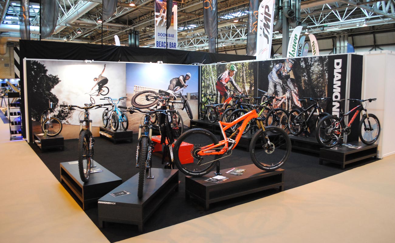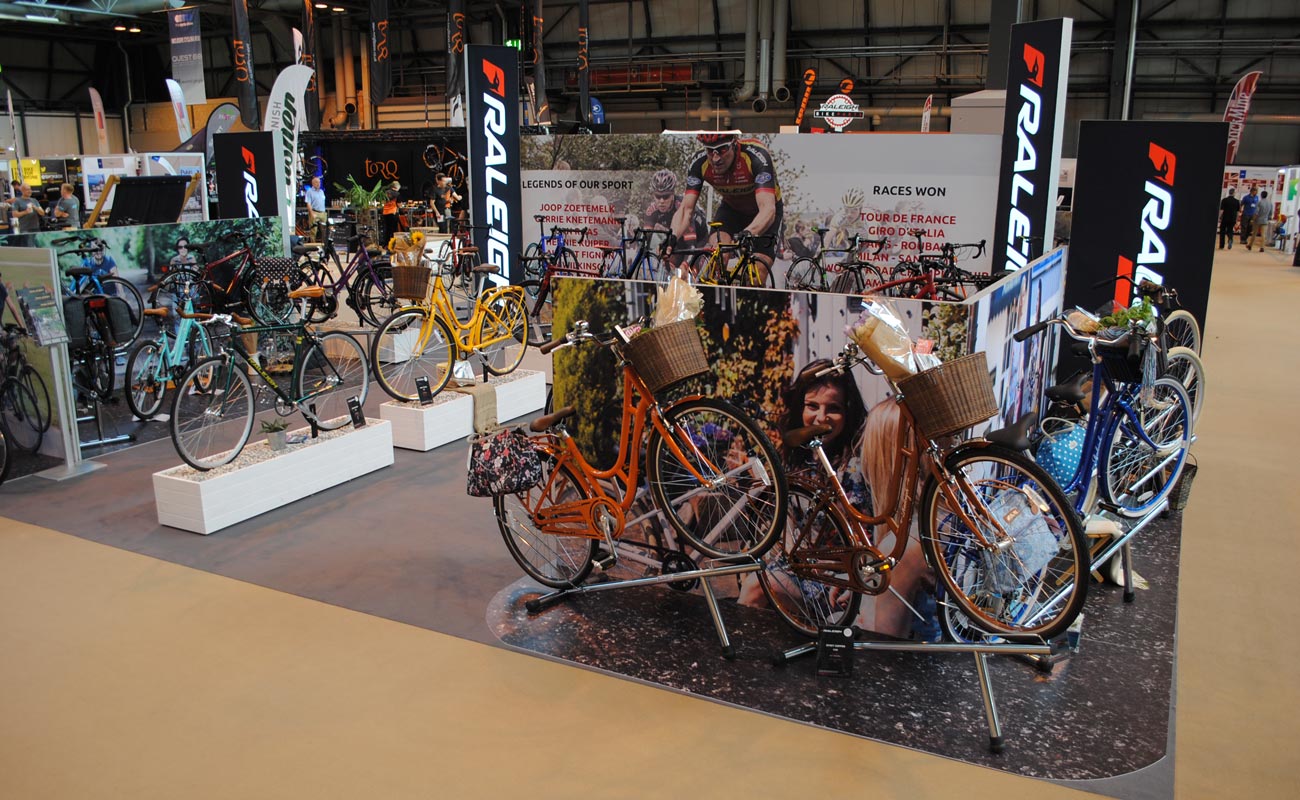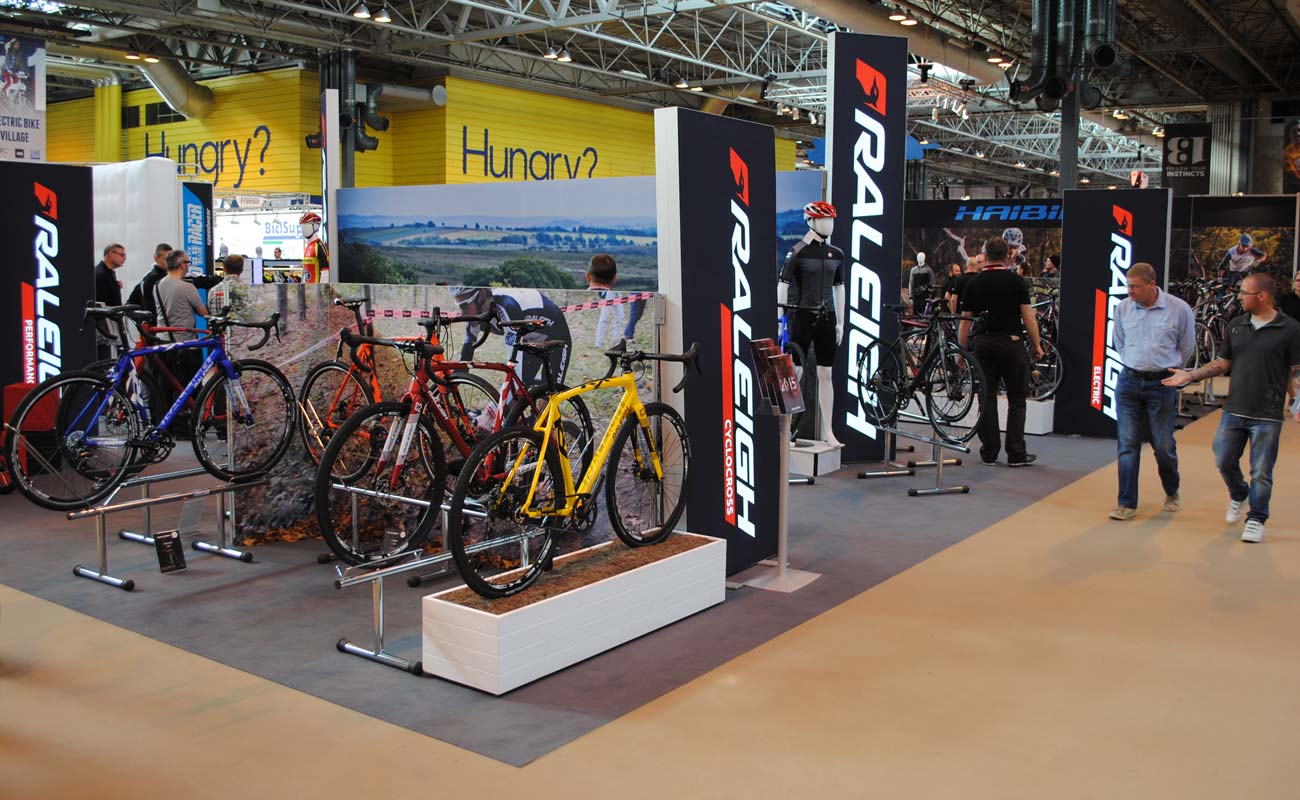 Modular graphics were the order of the day for these exhibition graphics. Raleigh attended many events throughout the year and often abroad too. These modular frames with custom printed graphics can be flat-packed, stored safely and transported easily. The Fabric Frame system also allows for multiple configurations depending on the venue and footprint size of the exhibition plot. A mixture of frontlit Fabric Graphics and illuminated Fabric Lightboxes were postioned over a custom printed floor graphic called PrismaFloor Lux.